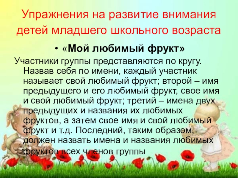 Участники группы представляются по кругу. Назвав себя по имени, каждый участник называет свой любимый фрукт; второй – имя предыдущего и его любимый фрукт, свое имя и свой любимый фрукт; третий – имена двух предыдущих и названия их любимых фруктов, а затем свое имя и свой любимый фрукт и т.д. Последний, таким образом, должен назвать имена и названия любимых фруктов всех членов группы