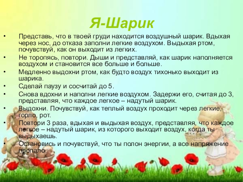 Не торопясь, повтори. Дыши и представляй, как шарик наполняется воздухом и становится все больше и больше.