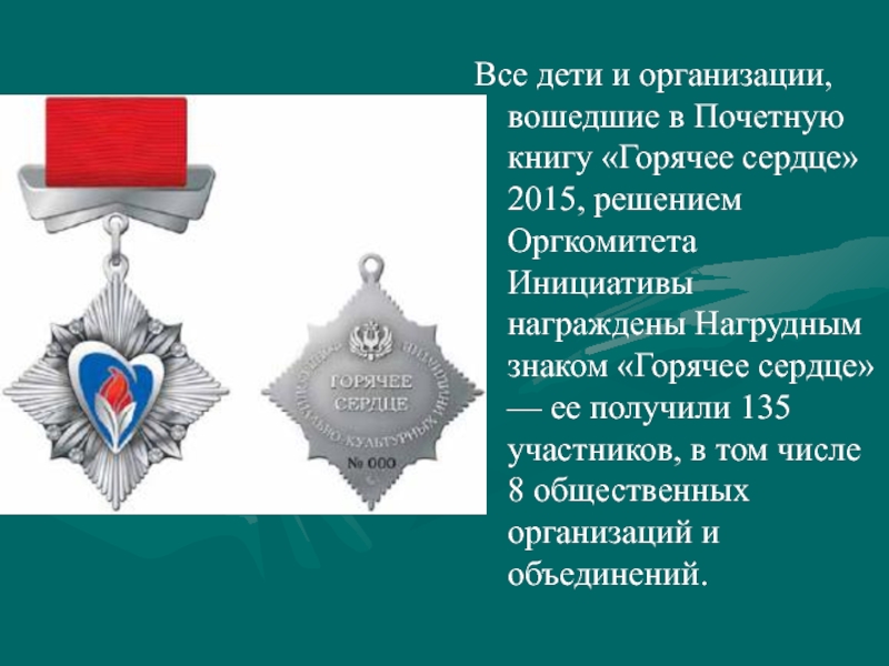 решением Оргкомитета Инициативы награждены Нагрудным знаком «Горячее сердце» — ее получили 135 участников, в том числе 8 общественных организаций и объединений.