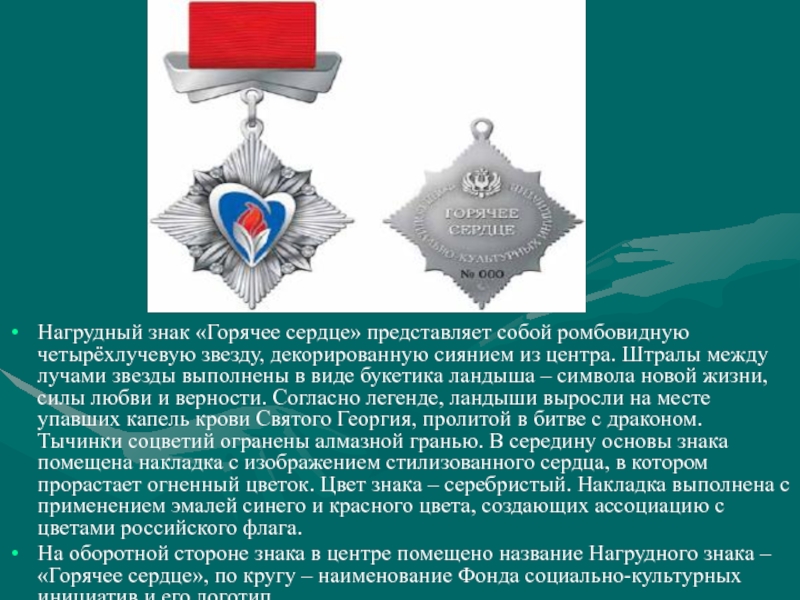 Слайд 8Нагрудный знак «Горячее сердце» представляет собой ромбовидную четырёхлучевую звезду, декорированную сиянием