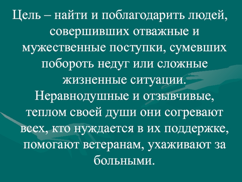 Слайд 5Цель – найти и поблагодарить людей, совершивших отважные и мужественные поступки,