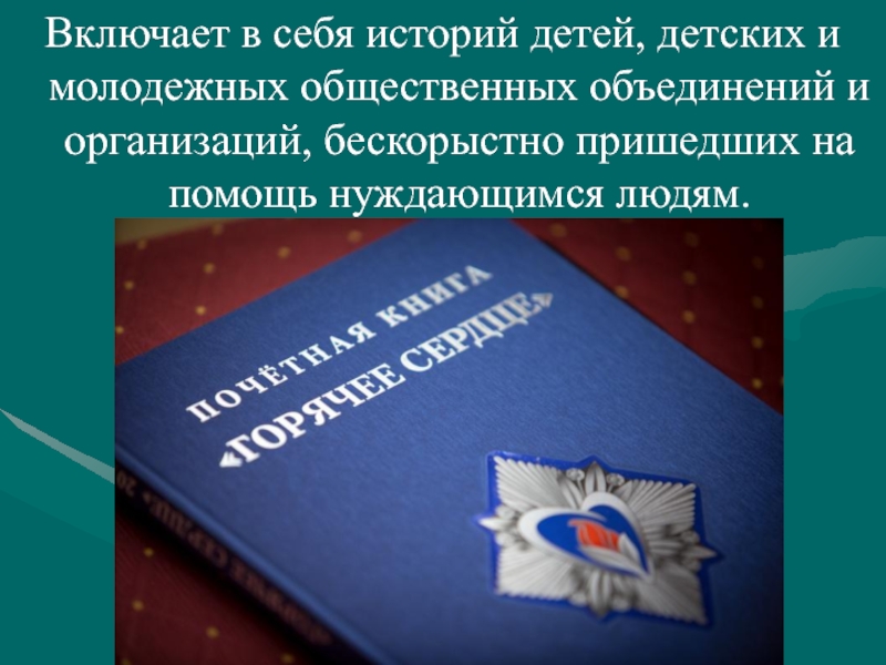 Слайд 6Включает в себя историй детей, детских и молодежных общественных объединений и