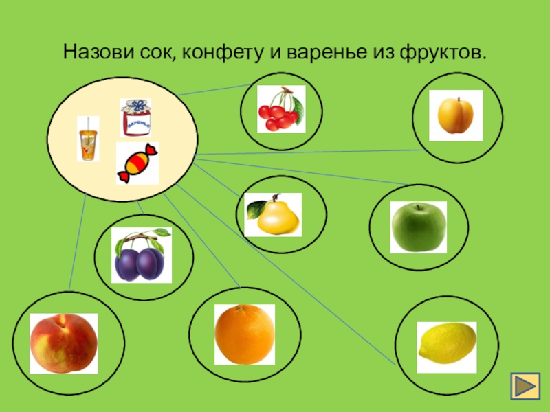 Слайд 4Назови сок, конфету и варенье из фруктов.