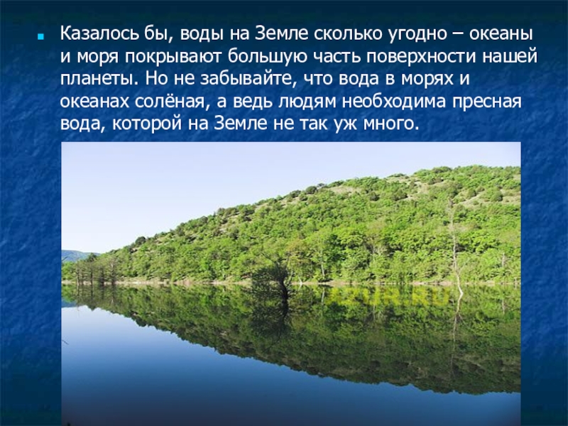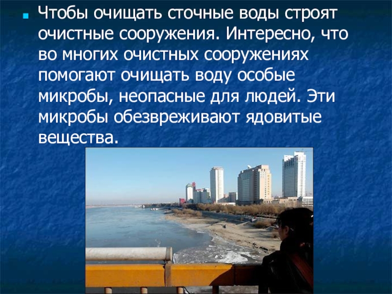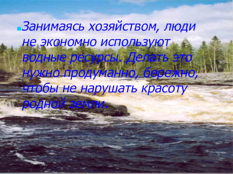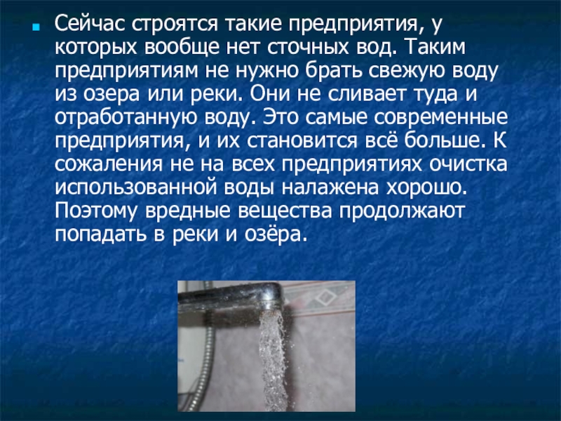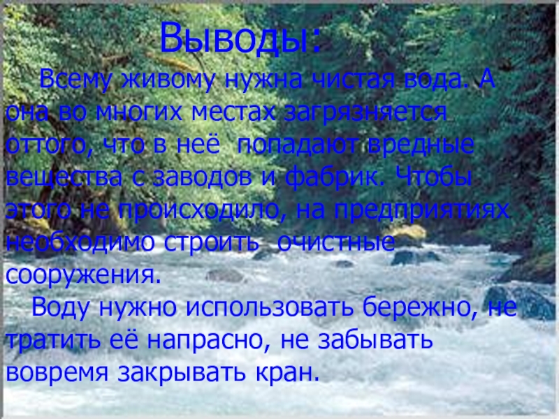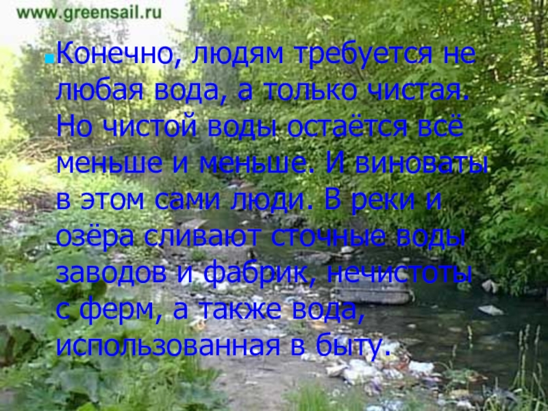 Конечно, людям требуется не любая вода, а только чистая. Но чистой воды остаётся всё меньше и меньше. И виноваты в этом сами люди. В реки и озёра сливают сточные воды заводов и фабрик, нечистоты с ферм, а также вода, использованная в быту.