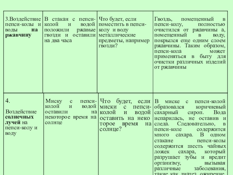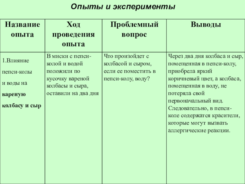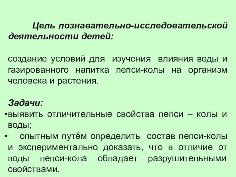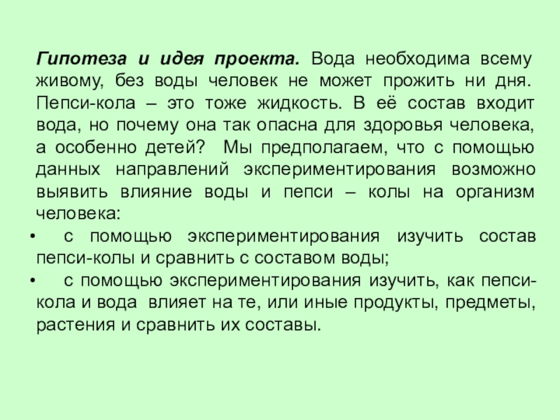 не может прожить ни дня. Пепси-кола – это тоже жидкость. В её состав входит вода, но почему она так опасна для здоровья человека, а особенно детей? Мы предполагаем, что с помощью данных направлений экспериментирования возможно выявить влияние воды и пепси – колы на организм человека: