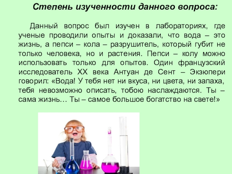 где ученые проводили опыты и доказали, что вода – это жизнь, а пепси – кола – разрушитель, который губит не только человека, но и растения. Пепси – колу можно использовать только для опытов. Один французский исследователь XX века Антуан де Сент – Экзюпери говорил: «Вода! У тебя нет ни вкуса, ни цвета, ни запаха, тебя невозможно описать, тобою наслаждаются. Ты – сама жизнь… Ты – самое большое богатство на свете!»