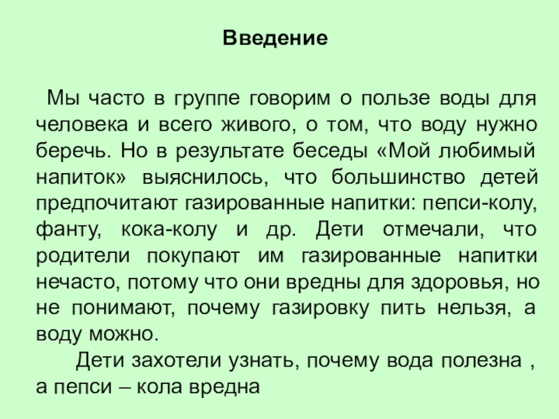 Мы часто в группе говорим о пользе воды для человека и всего живого, о том, что воду нужно беречь. Но в результате беседы «Мой любимый напиток» выяснилось, что большинство детей предпочитают газированные напитки: пепси-колу, фанту, кока-колу и др. Дети отмечали, что родители покупают им газированные напитки нечасто, потому что они вредны для здоровья, но не понимают, почему газировку пить нельзя, а воду можно.