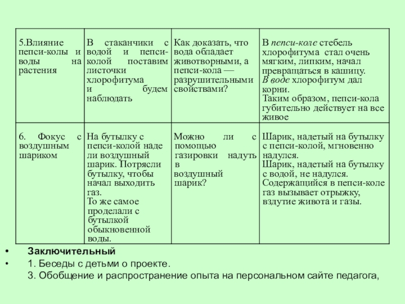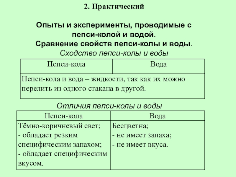 с помощью экспериментирования изучить, как пепси-кола и вода влияет на те, или иные продукты, предметы, растения и сравнить их составы.