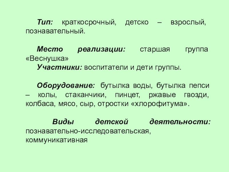 Слайд 7Тип: краткосрочный, детско – взрослый, познавательный.