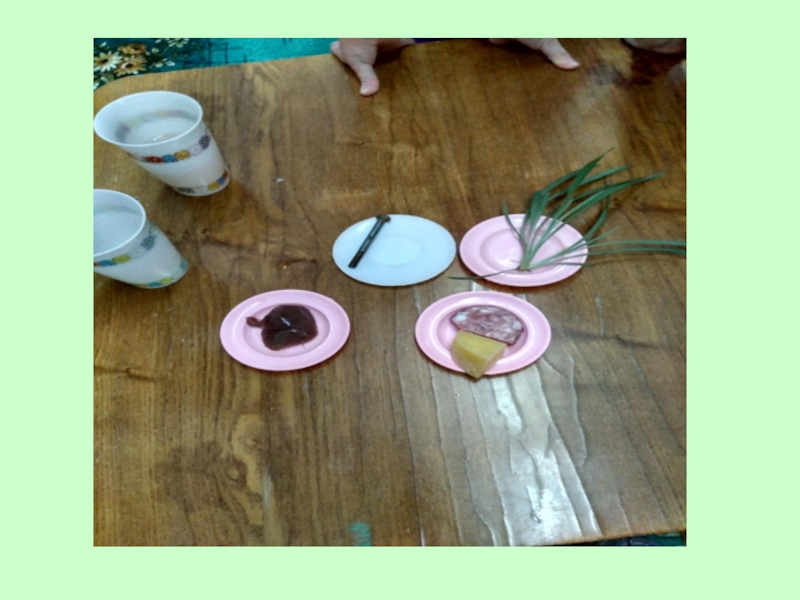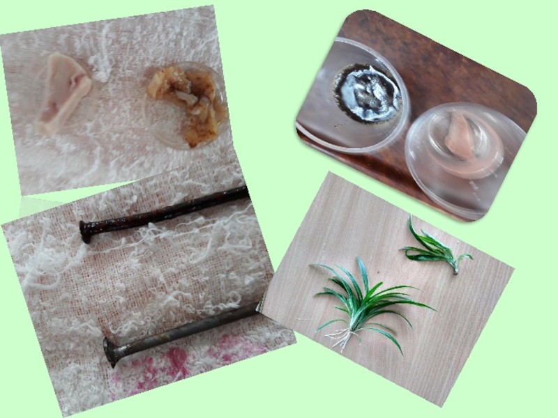 Оборудование: бутылка воды, бутылка пепси – колы, стаканчики, пинцет, ржавые гвозди, колбаса, мясо, сыр, отростки «хлорофитума».