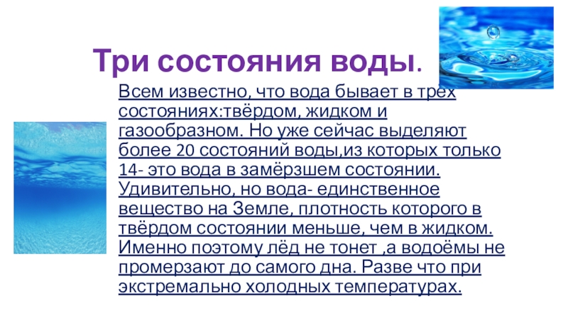 Три состояния воды.Всем известно, что вода бывает в трёх состояниях:твёрдом, жидком и газообразном.