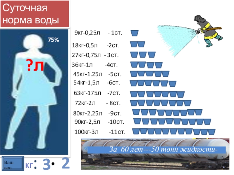 1. Воду нужно пить не менее 1,5 литра в день (30 мл на кг веса). Ведь вода играет важную роль в организме, в том числе и в регуляции веса. Клетки в основном состоят из воды. Если они получают чистую живую воду, то они в свою очередь могут активизировать собственный обмен веществ и эффективно сжигать жир