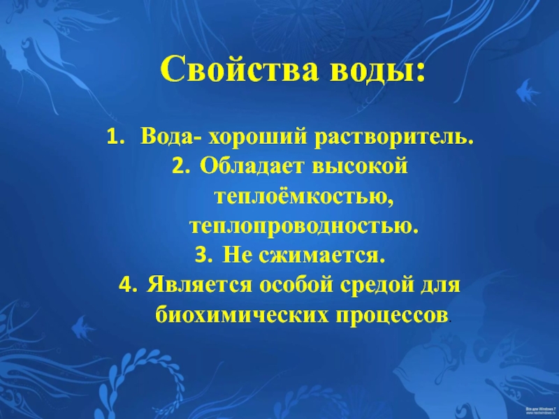 Свойства воды: Вода- хороший растворитель.Обладает высокой теплоёмкостью, теплопроводностью.Не сжимается.Является особой средой для биохимических процессов.