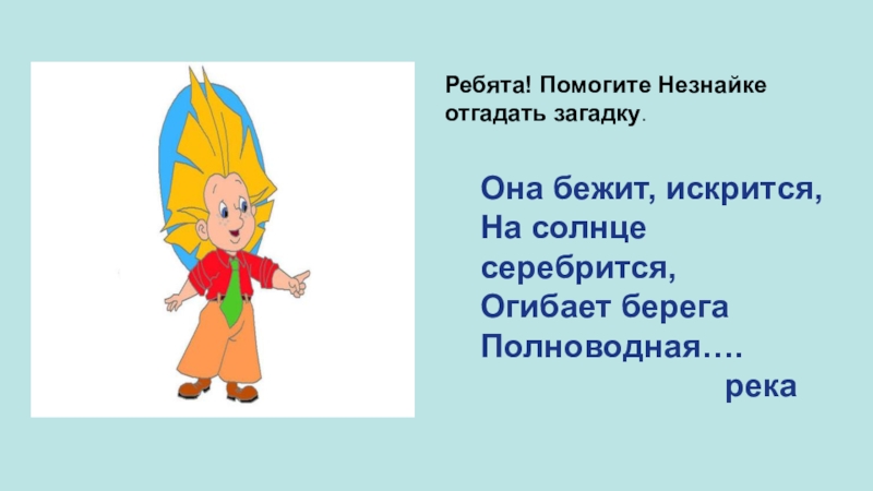 Ребята! Помогите Незнайке отгадать загадку.Она бежит, искрится,На солнце серебрится,Огибает берегаПолноводная…. река
