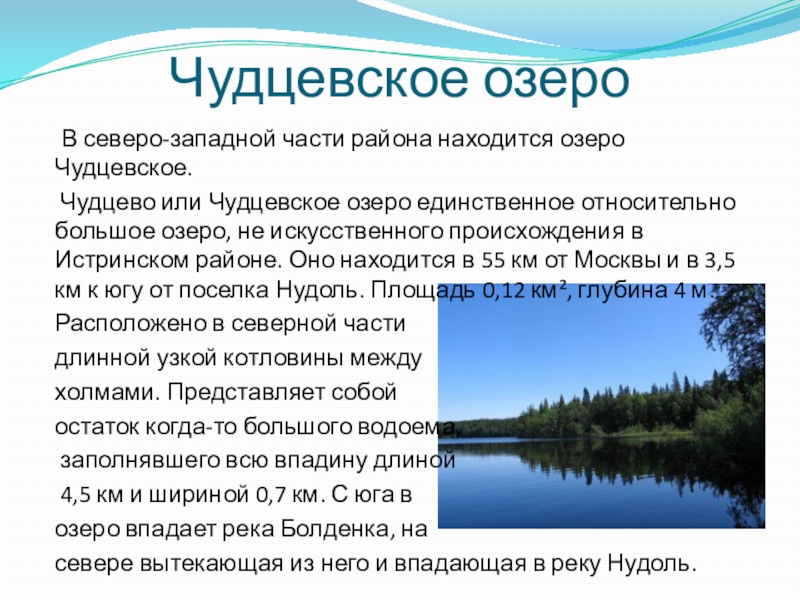 Чудцевское озеро единственное относительно большое озеро, не искусственного происхождения в Истринском районе. Оно находится в 55 км от Москвы и в 3,5 км к югу от поселка Нудоль. Площадь 0,12 км², глубина 4 м.