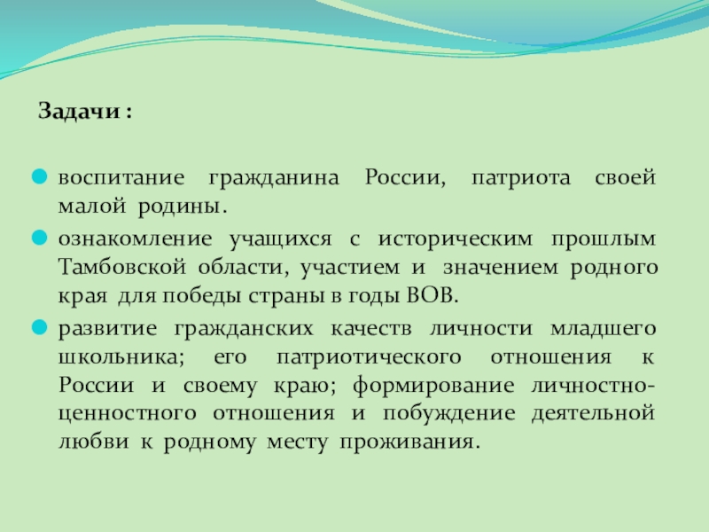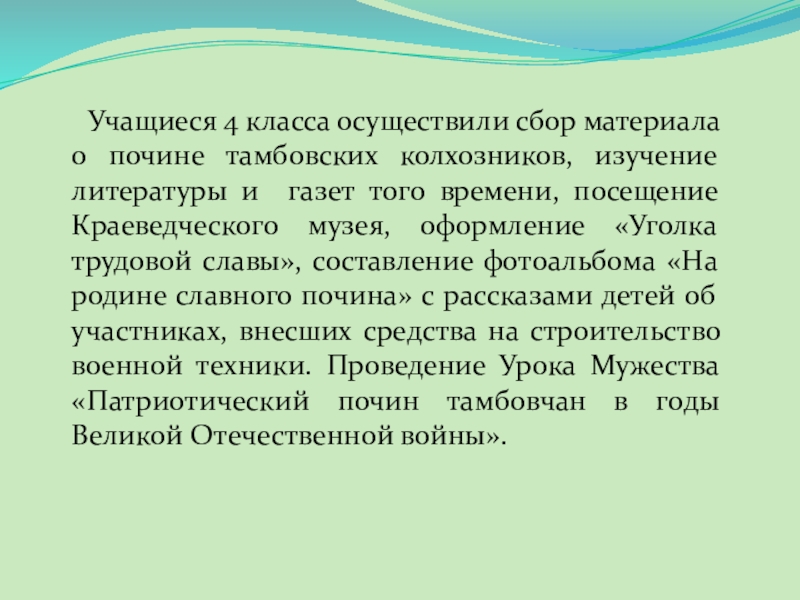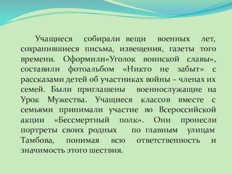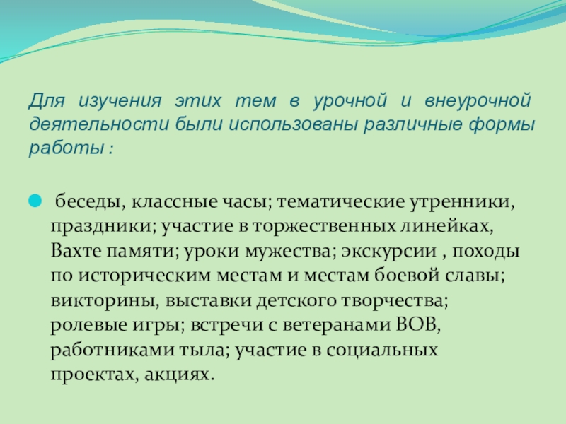 беседы, классные часы; тематические утренники, праздники; участие в торжественных линейках, Вахте памяти; уроки мужества; экскурсии , походы по историческим местам и местам боевой славы; викторины, выставки детского творчества; ролевые игры; встречи с ветеранами ВОВ, работниками тыла; участие в социальных проектах, акциях.