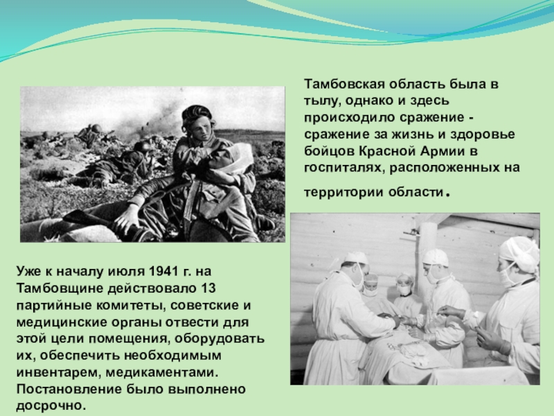 Тамбовская область была в тылу, однако и здесь происходило сражение - сражение за жизнь и здоровье бойцов Красной Армии в госпиталях, расположенных на территории области.