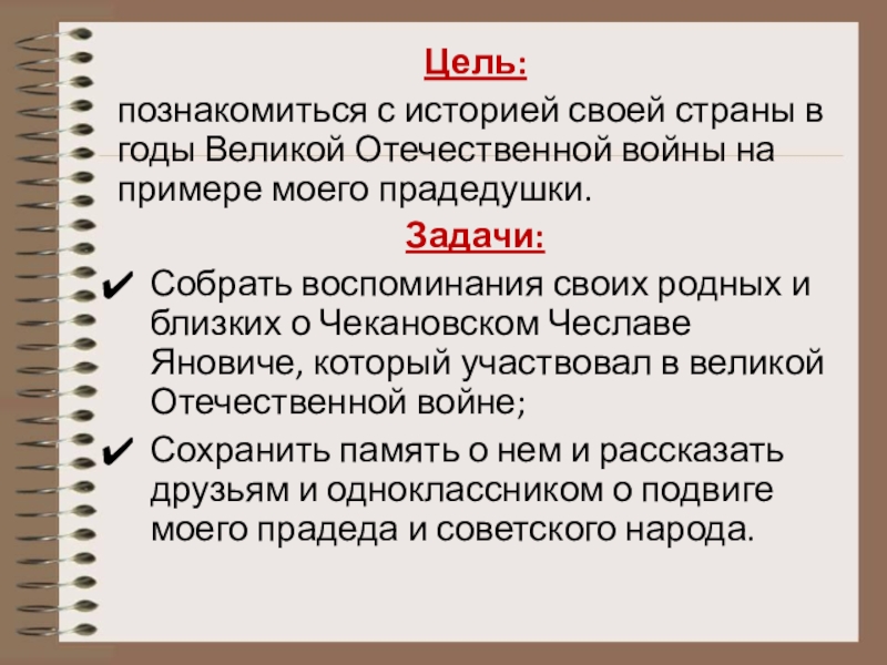 Цель: познакомиться с историей своей страны в годы Великой Отечественной войны на примере моего прадедушки.Задачи:Собрать воспоминания своих родных и близких о Чекановском Чеславе Яновиче, который участвовал в великой Отечественной войне;Сохранить память о нем и рассказать друзьям