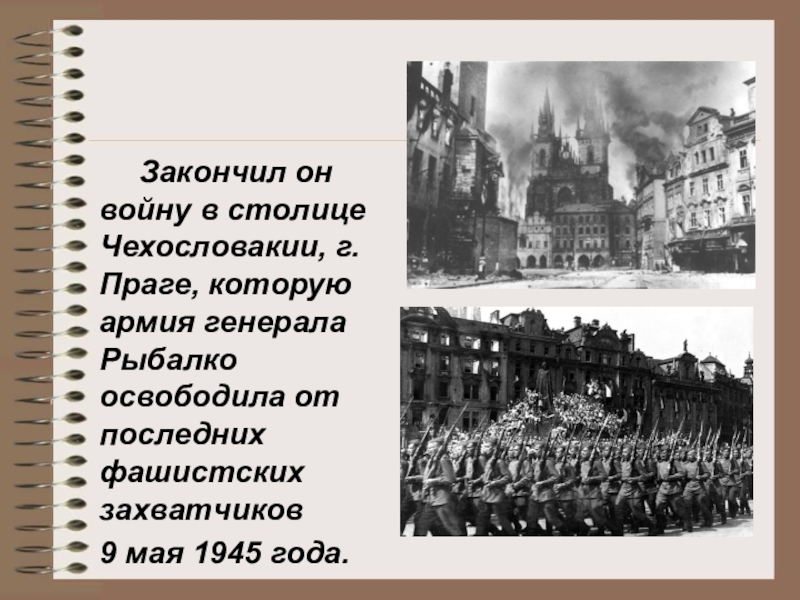 Слайд 8 Закончил он войну в столице Чехословакии, г. Праге, которую армия генерала