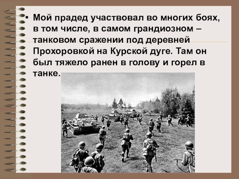 Мой прадед участвовал во многих боях, в том числе, в самом грандиозном – танковом сражении под деревней