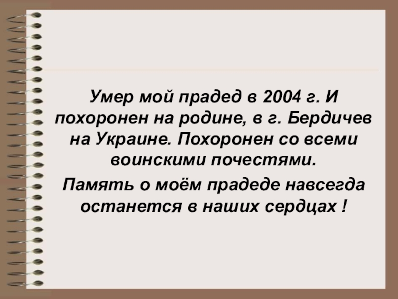 Слайд 11Умер мой прадед в 2004 г. И похоронен на родине, в