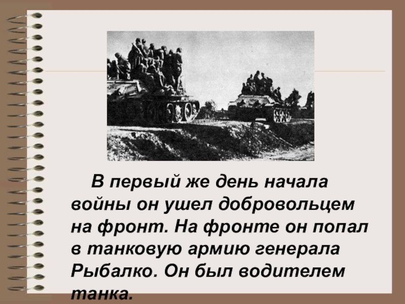 Слайд 4 В первый же день начала войны он ушел добровольцем на фронт.