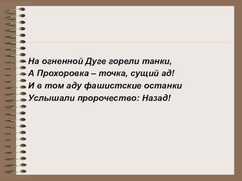 На огненной Дуге горели танки,А Прохоровка – точка, сущий ад!И в том аду фашистские останкиУслышали пророчество: Назад!
