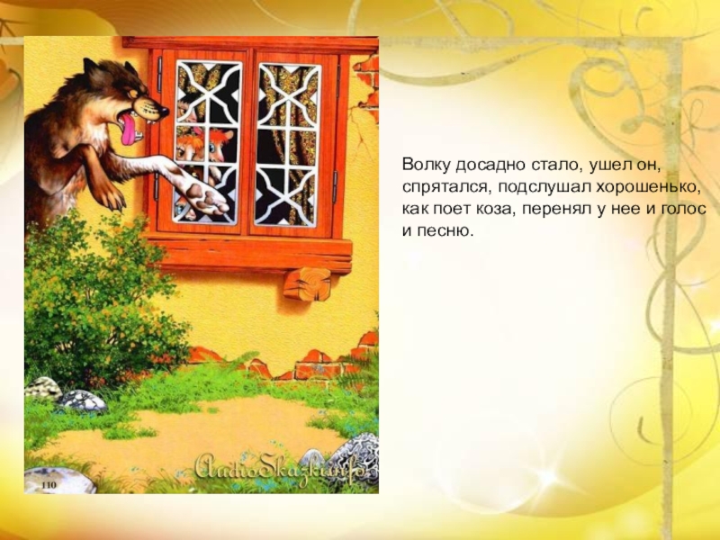 Дети отворят, она покормит их и уйдет опять. Подслушал это волк: