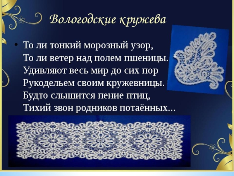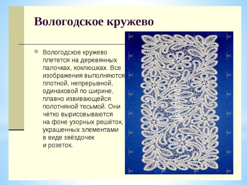 хранит драгоценное наследие народного искусства. Традиции его живут и развиваются на Вологодской земле. Они выражаются в изделиях традиционного крестьянского ремесла, сохранившегося в форме домашнего творчества в исторически сложившихся центрах художественных промыслов Вологодчины – в ткачестве, вышивке, плетении из бересты и лыка, резьбе и росписи по дереву, а также во всемирно известных вологодских кружевах, устюжской черни, шемогодской бересте.
