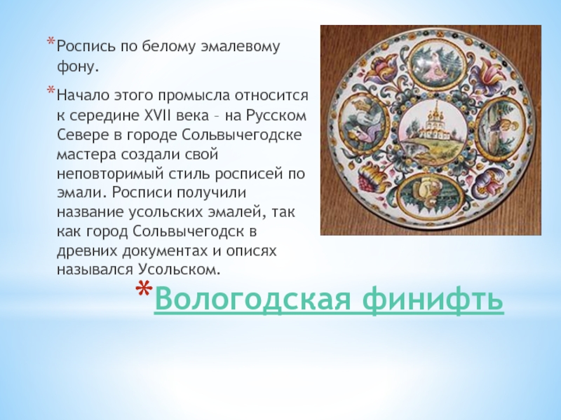 середине XVII века – на Русском Севере в городе Сольвычегодске мастера создали свой неповторимый стиль росписей по эмали. Росписи получили название усольских эмалей, так как город Сольвычегодск в древних документах и описях назывался Усольском.
