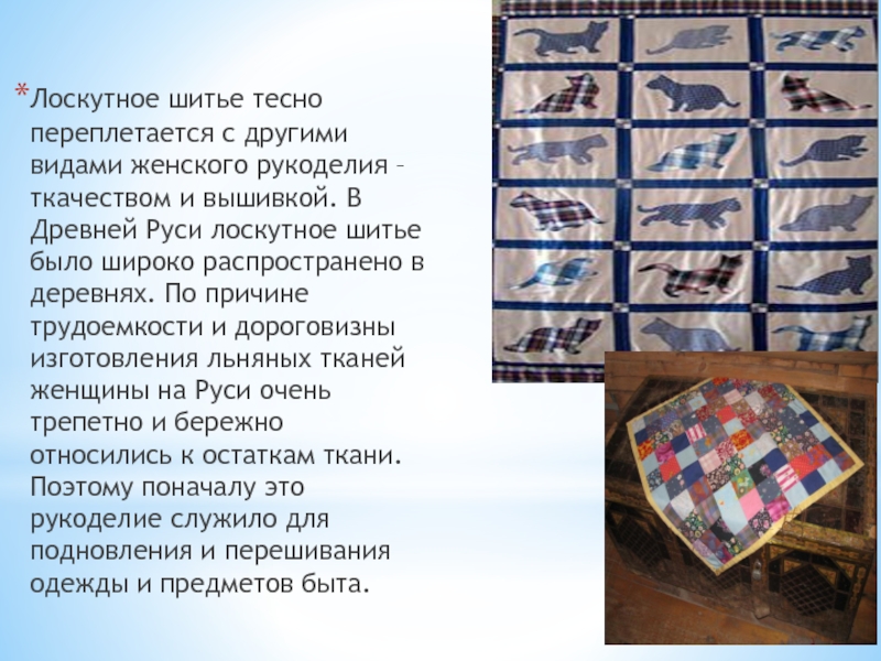 Слайд 10Лоскутное шитье тесно переплетается с другими видами женского рукоделия – ткачеством