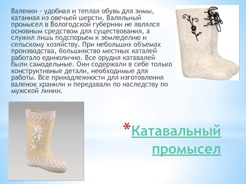 овечьей шерсти. Валяльный промысел в Вологодской губернии не являлся основным средством для существования, а служил лишь подспорьем к земледелию и сельскому хозяйству. При небольших объемах производства, большинство местных каталей работало единолично. Все орудия катавалей были самодельные. Они содержали в себе только конструктивные детали, необходимые для работы. Все принадлежности для изготовления валенок хранили и передавали по наследству по мужской линии.