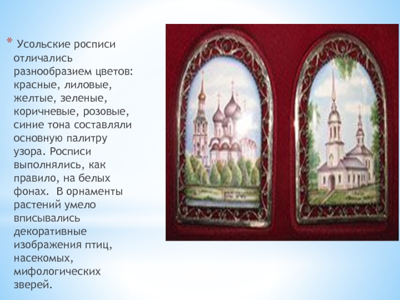 Усольские росписи отличались разнообразием цветов: красные, лиловые, желтые, зеленые, коричневые,