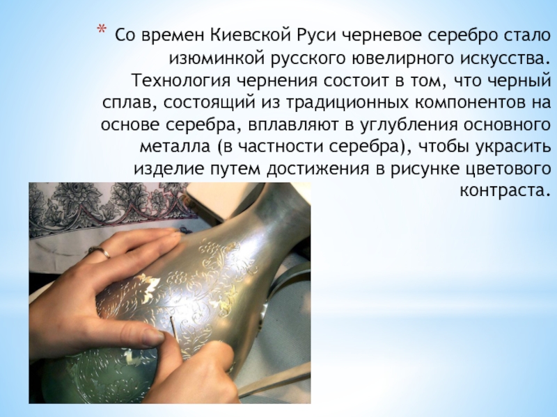 Слайд 22Со времен Киевской Руси черневое серебро стало изюминкой русского ювелирного искусства.