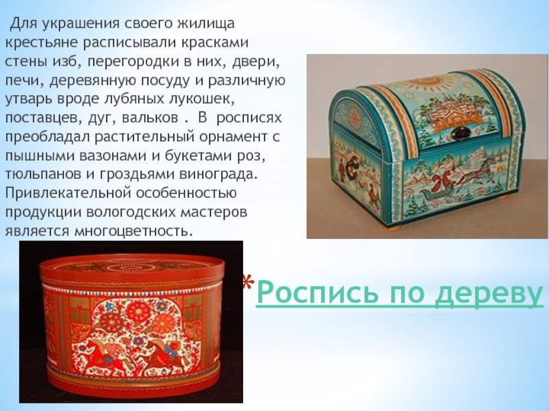 изб, перегородки в них, двери, печи, деревянную посуду и различную утварь вроде лубяных лукошек, поставцев, дуг, вальков . В росписях преобладал растительный орнамент с пышными вазонами и букетами роз, тюльпанов и гроздьями винограда. Привлекательной особенностью продукции вологодских мастеров является многоцветность.