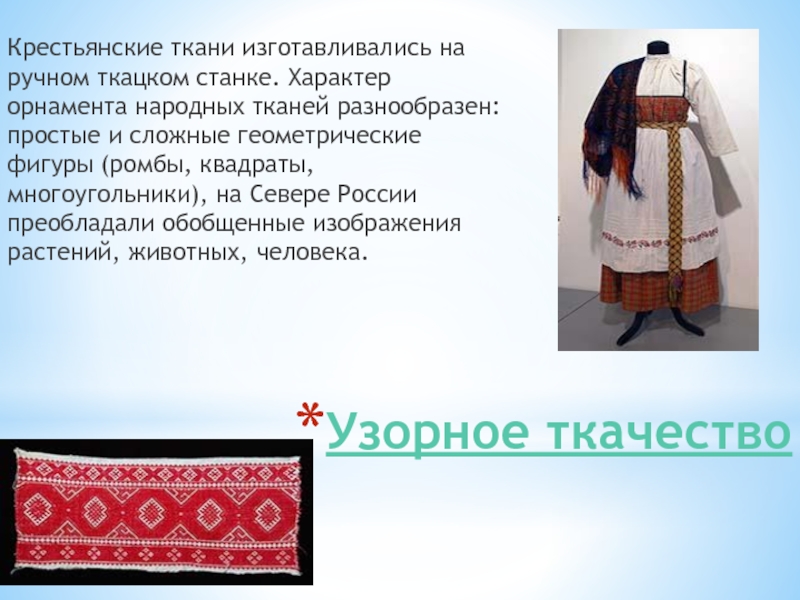 Крестьянские ткани изготавливались на ручном ткацком станке. Характер орнамента народных
