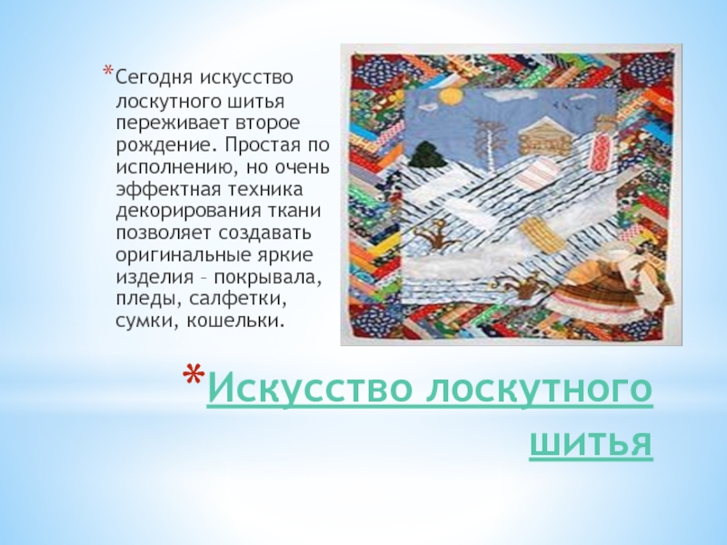 Слайд 11Искусство лоскутного шитья