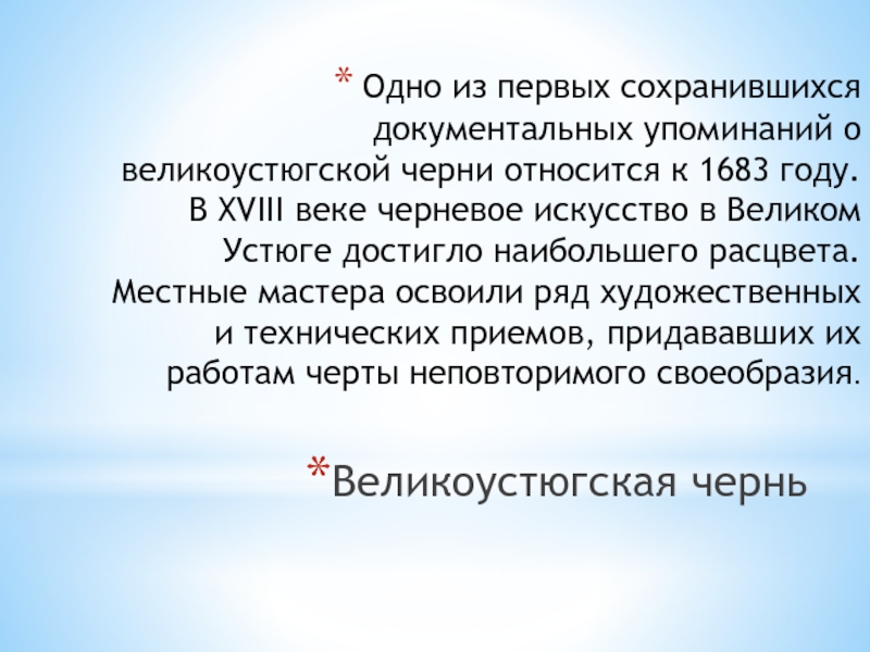 Слайд 21Одно из первых сохранившихся документальных упоминаний о великоустюгской черни относится к