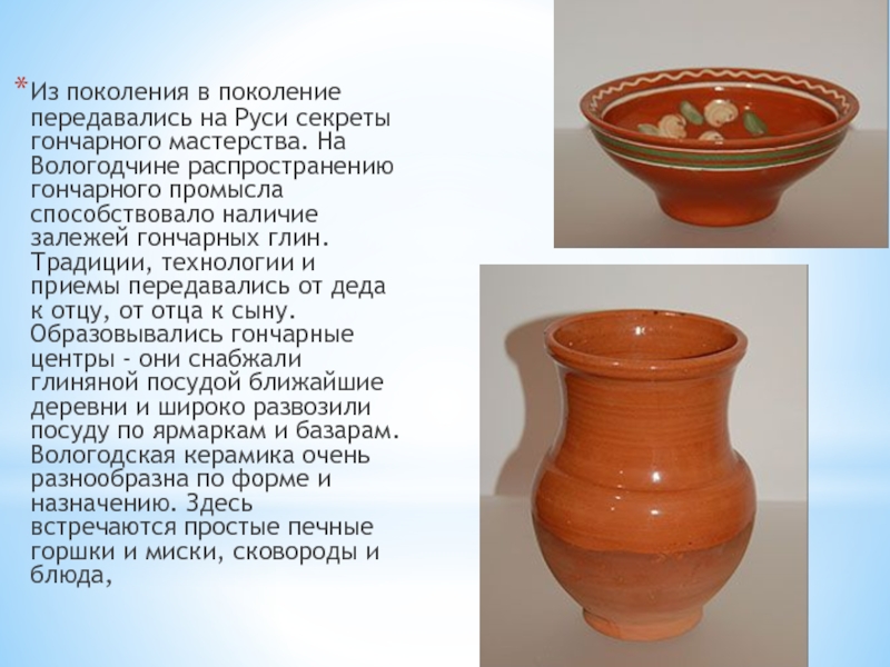Вологодчине распространению гончарного промысла способствовало наличие залежей гончарных глин. Традиции, технологии и приемы передавались от деда к отцу, от отца к сыну. Образовывались гончарные центры - они снабжали глиняной посудой ближайшие деревни и широко развозили посуду по ярмаркам и базарам. Вологодская керамика очень разнообразна по форме и назначению. Здесь встречаются простые печные горшки и миски, сковороды и блюда,