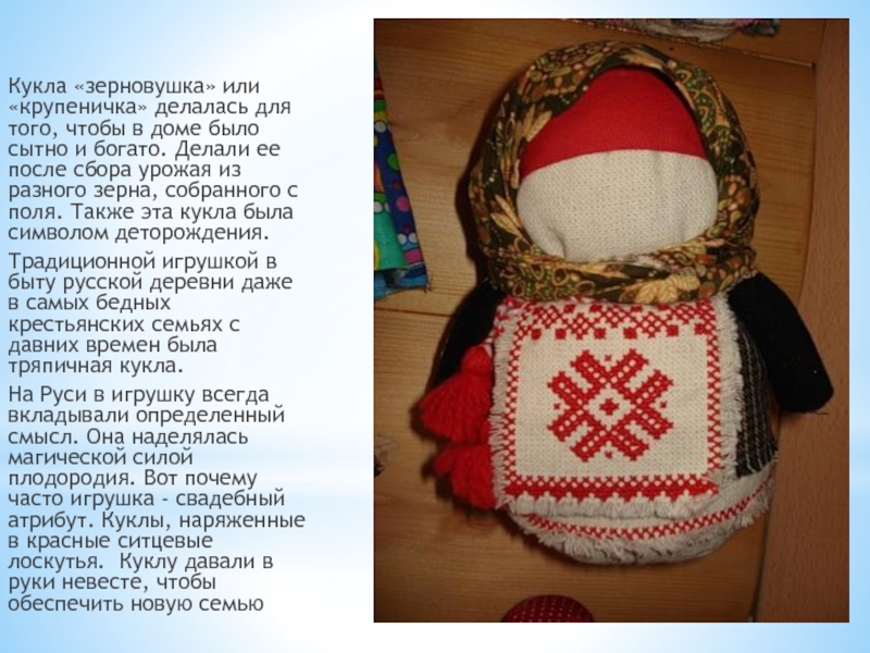 Слайд 13Кукла «зерновушка» или «крупеничка» делалась для того, чтобы в доме было