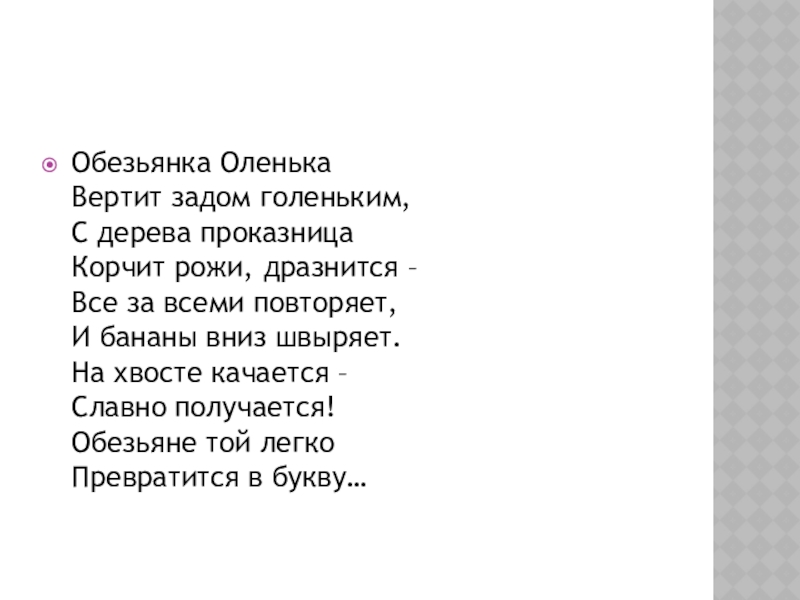 повторяет, И бананы вниз швыряет. На хвосте качается – Славно получается! Обезьяне той легко Превратится в букву…