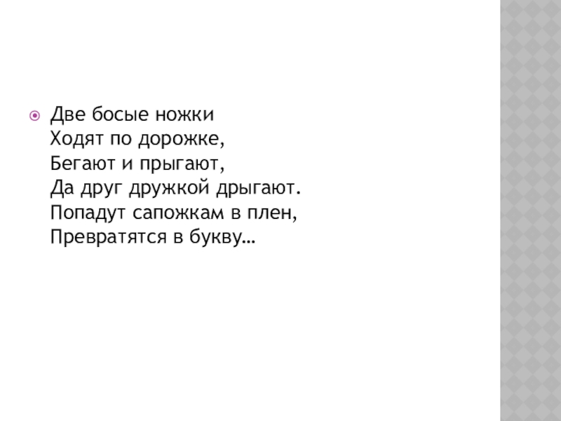 Слайд 6Две босые ножки  Ходят по дорожке, Бегают и прыгают, Да друг дружкой дрыгают. Попадут сапожкам