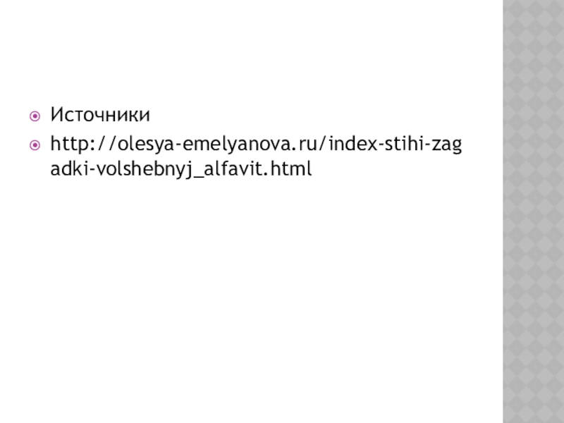 Источникиhttp://olesya-emelyanova.ru/index-stihi-zagadki-volshebnyj_alfavit.html