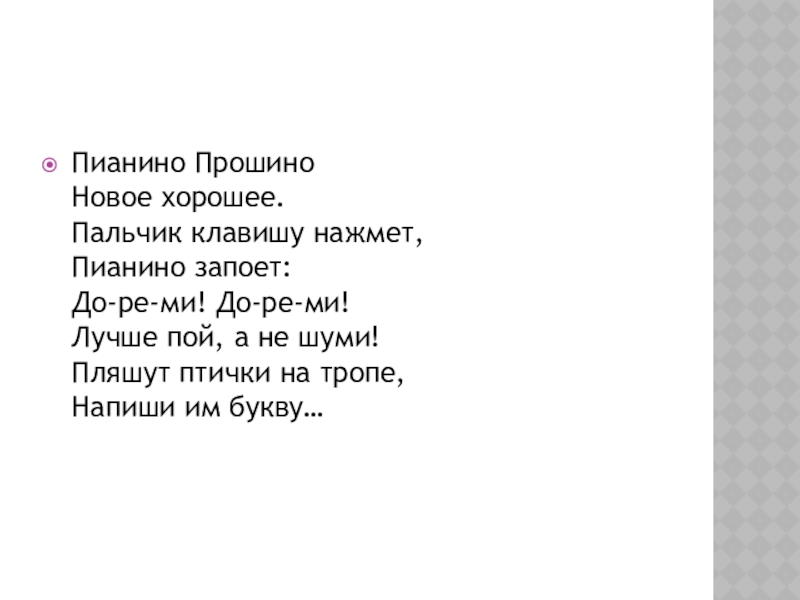 Слайд 8Пианино Прошино Новое хорошее. Пальчик клавишу нажмет, Пианино запоет: До-ре-ми! До-ре-ми! Лучше пой, а не шуми! Пляшут
