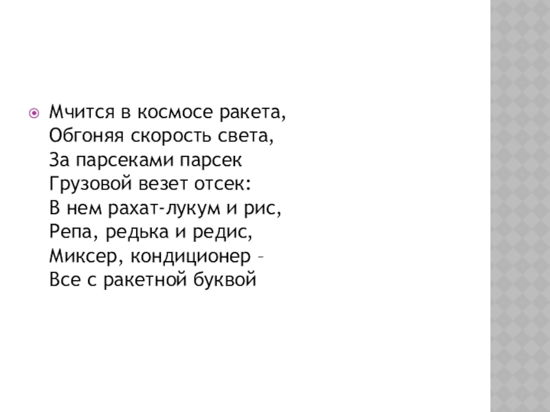 Слайд 9Мчится в космосе ракета, Обгоняя скорость света, За парсеками парсек Грузовой везет отсек: В нем