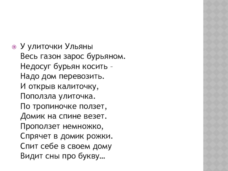 открыв калиточку, Поползла улиточка. По тропиночке ползет, Домик на спине везет. Проползет немножко, Спрячет в домик рожки. Спит себе в своем дому Видит сны про букву…