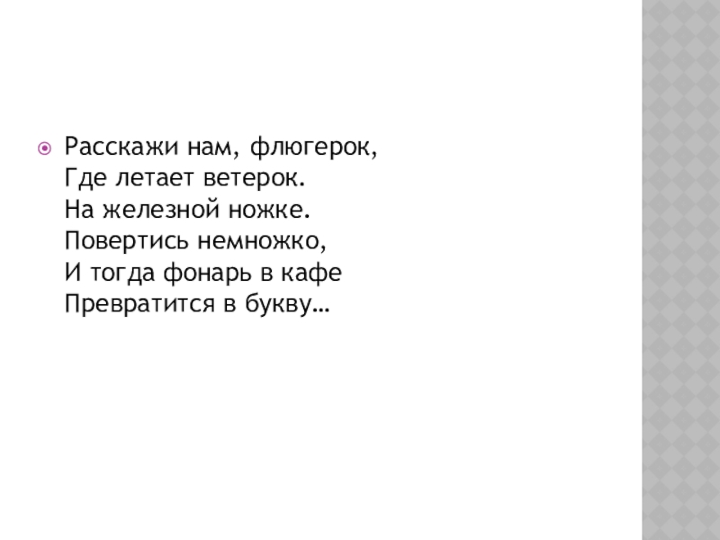 Расскажи нам, флюгерок, Где летает ветерок. На железной ножке. Повертись немножко, И тогда фонарь в кафе Превратится