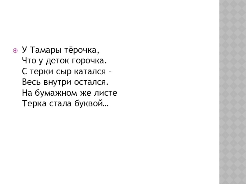 Слайд 11У Тамары тёрочка, Что у деток горочка. С терки сыр катался – Весь внутри