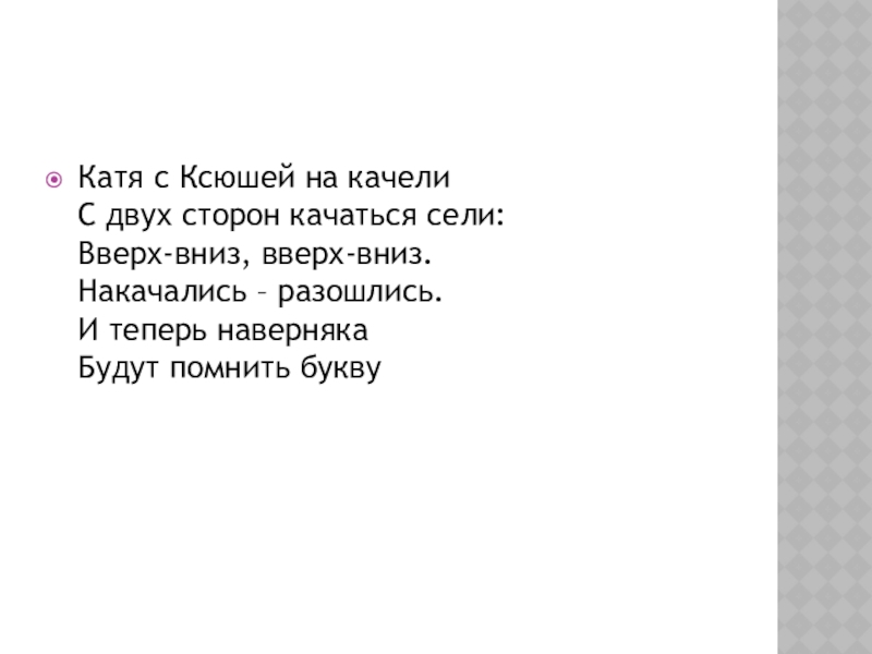 Слайд 3Катя с Ксюшей на качели С двух сторон качаться сели: Вверх-вниз, вверх-вниз. Накачались –