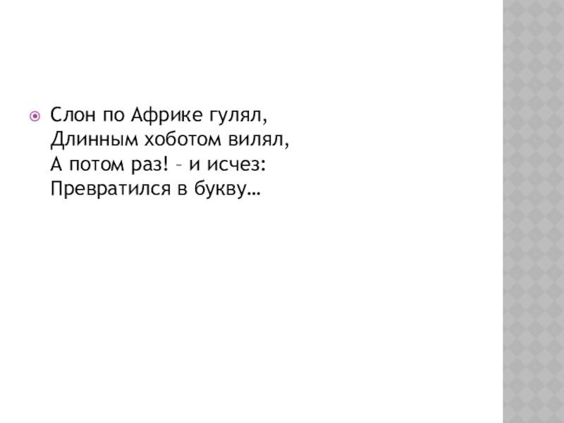 Слон по Африке гулял, Длинным хоботом вилял, А потом раз! – и исчез: Превратился в букву…